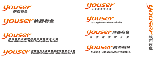 同时,在英语中er是表示人的名词化后缀,比如teacher; worker等。因此,youser体现企业是人的联合体,体现企业“以人为本”的核心理念。标志以完全独立设计的美术英文字体为为主体,配以中文字体,具备独特性,同时更加适合同权属企业标志组合。标志色彩为初升太阳的橘红色,象征着陕西有色集团作为新型的大型集团企业,好像一轮蓬勃的红日,朝气蓬勃。