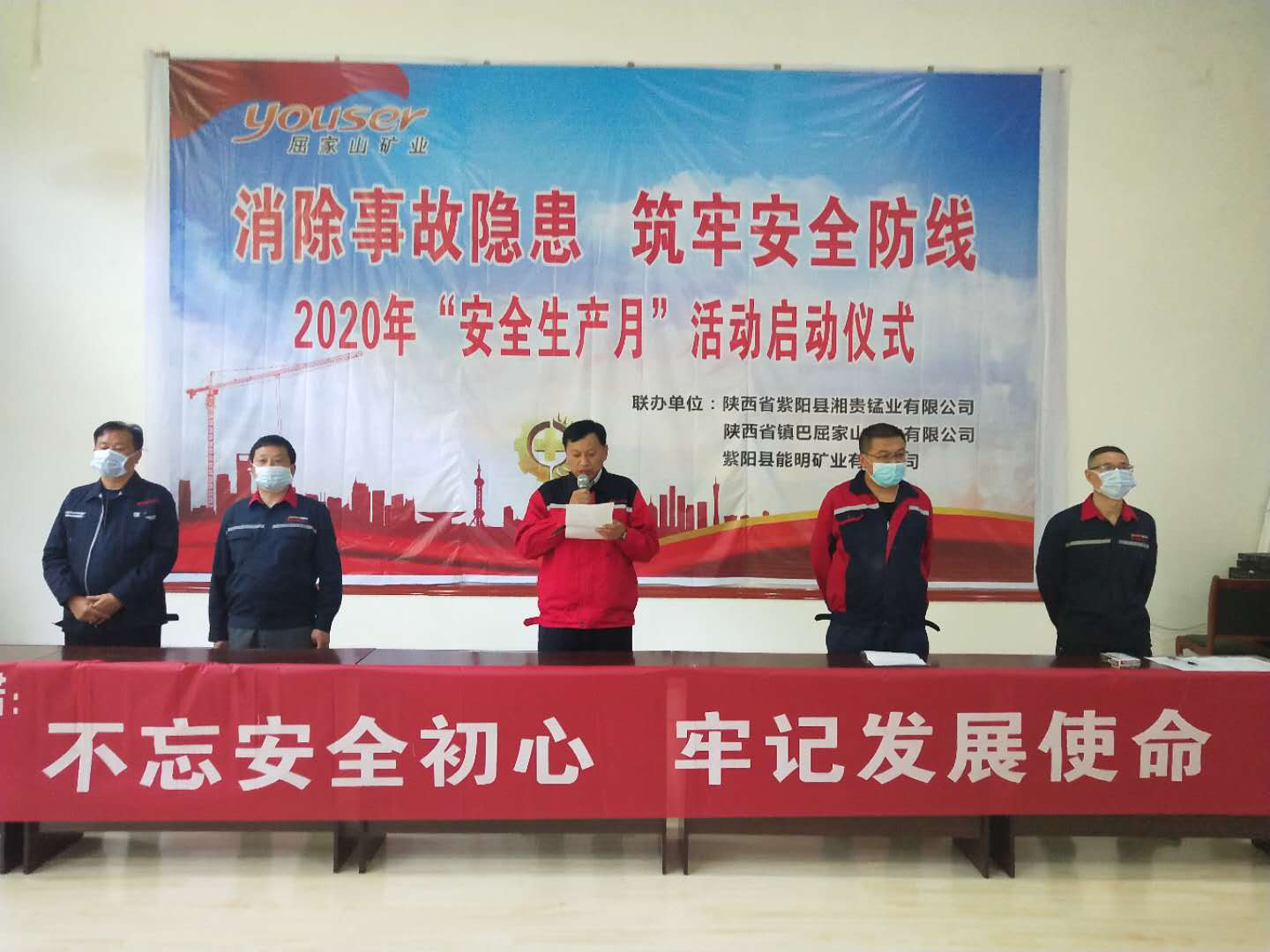 随着疫情发展的有效遏制,各企业复工复产加快,安全隐患逐渐升高,安全形势依旧严峻。为进一步增强安全生产意识,提升企业安全管理素质,紧紧围绕国家“消除事故隐患、筑牢安全防线”主题,6月1日,冶矿集团权属湘贵锰业、屈家山矿业、能明矿业联合举办了2020年“安全生产月”活动启动仪式。