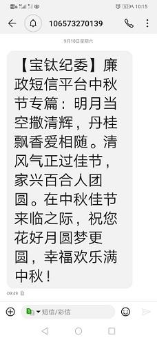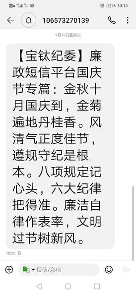 宝钛集团纪委利用宝钛启明星微信公众号、宝钛OA协同网等新媒体平台,转载中央纪委国家监委在中秋、国庆节前通报曝光的违反中央八项规定精神典型案例,在利用反面典型开展警示教育的同时,一改往日说教式短信的文风,结合中秋、国庆的节日特点,自编原创以廉洁过节为主题的“打油诗”。9月18日,以“明月当空洒清辉,丹桂飘香爱相随。清风气正过佳节,家兴百合人团圆。在中秋佳节来临之际,祝您花好月圆梦更圆,幸福欢乐满中秋”为内容;9月30日,以“金秋十月国庆到,金菊遍地丹桂香。风清气正度佳节,遵规守纪是根本。八项规定记心头,六大纪律把得准。廉洁自律作表率,文明过节树新风”为内容,通过宝钛廉政短信平台向公司全体中层及以上干部发送节前提醒短信2条、共450人次。