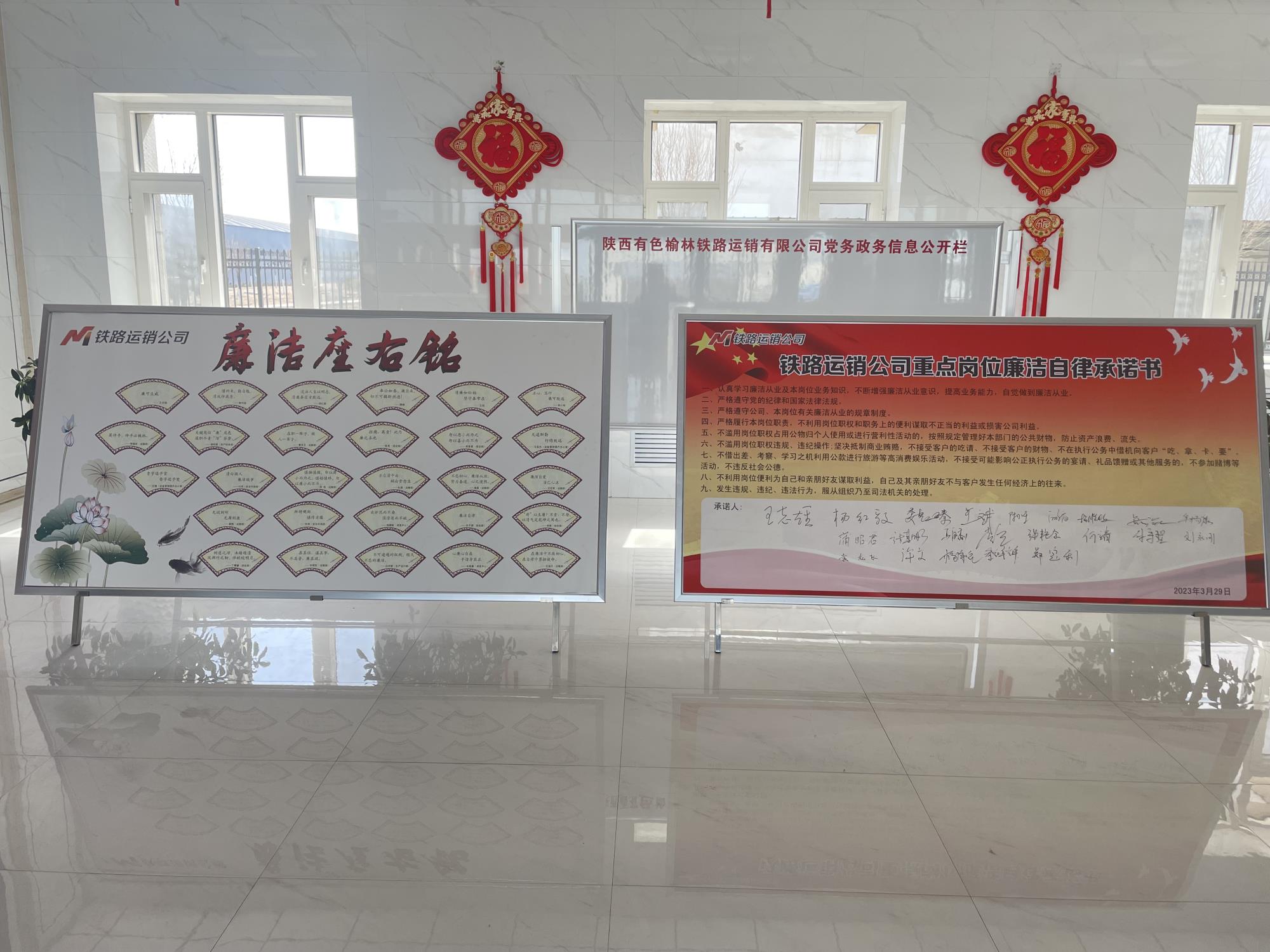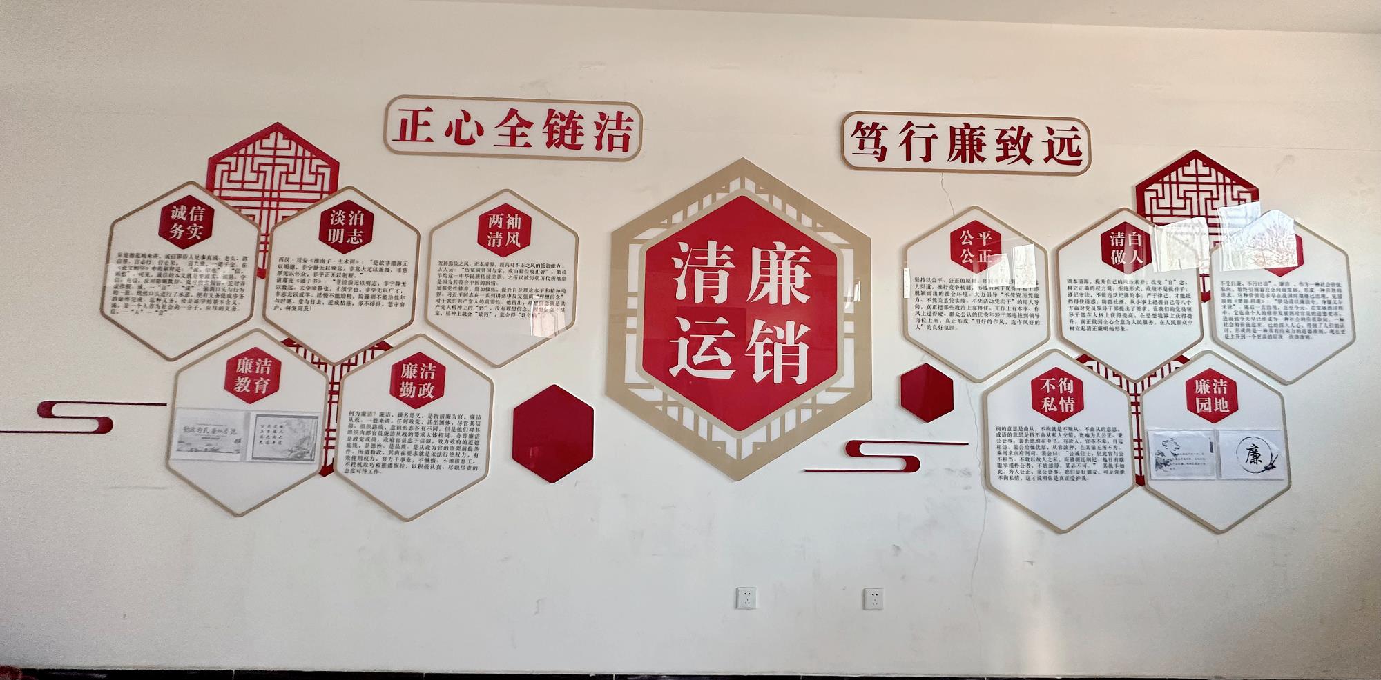 铁路运销公司充分利用办公楼、生产区域等地,打造廉洁清风碑、廉洁文化宣传栏、廉洁文化长廊、廉洁文化墙4处廉洁文化阵地。其中廉洁文化长廊,以榆林新材料集团廉洁文化核心理念“正心全链洁、笃行廉致远”为主题,涵盖公司廉洁文化建设目标、管理理念、廉洁文化落地等11项内容;廉洁文化墙以“学习教育”为主题,内容涵盖两袖清风、不徇私情等8项内容。通过廉洁文化阵地建设,不断筑牢党员干部拒腐防变的思想防线,真正做到将廉洁理念、廉洁文化融入日常,引导党员干部夯实廉洁从政思想道德根基,营造风清气正的良好工作氛围。