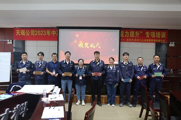 培训结业仪式上,人力资源部经理张永亮和党群工作部主任胡磊分别作了结业发言,对两位授课讲师的精彩授课表示感谢,对本次参加培训的学员表示祝贺。他们勉励所有参训人员,要把本次培训学习作为个人管理能力提升的一个新起点,同日常管理工作实际结合起来,加强学习、提高修养,不断完善自己、提高自己,在今后的工作岗位上扎实工作、开拓进取,为天瑞硅材料的发展作出应有的贡献。