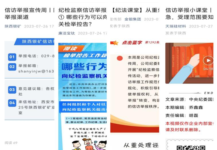 充分借助“线上”便捷优势,在企业微信公众号开设“信访举报小课堂”专栏,对纪检监察信访举报受理事项、受理层级、举报要素和举报人权利义务等进行详细解读。同时,公布来信、来访地址和电话、邮箱举报方式等,畅通信访举报渠道,让职工群众时刻有地方举报,时刻能行使信访举报监督的权力,使职工群众监督与党内监督不断贯通融合。