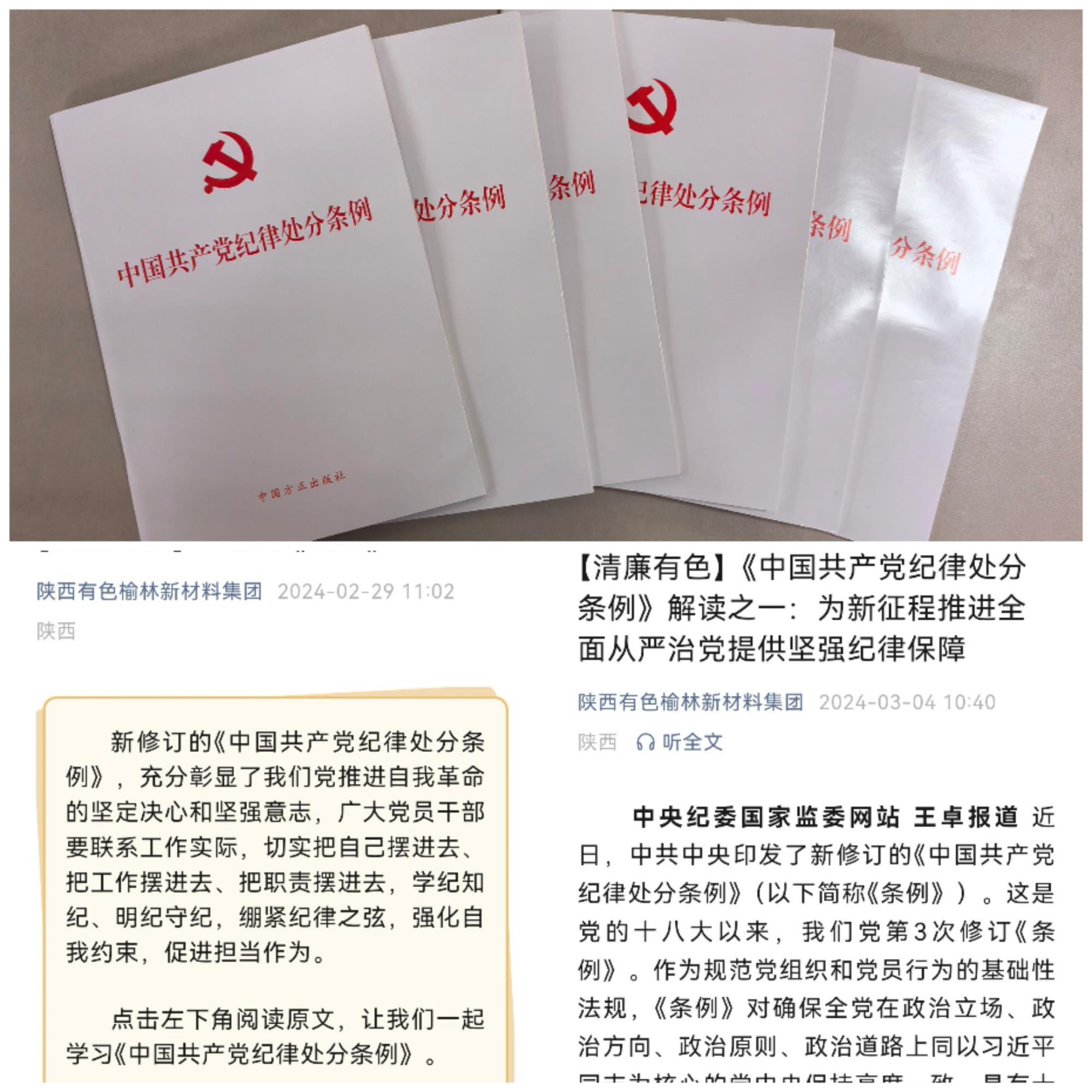 新修订的《中国共产党纪律处分条例》印发以来,榆林新材料集团纪委始终把学习贯彻《条例》作为一项重要政治任务和深入贯彻落实二十届中央纪委三次全会精神及十四届省纪委三次全会精神的重要举措,切实发挥职能作用,主动做学习贯彻《条例》的实践者、推动者、监督者。