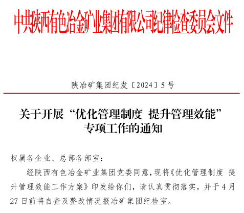 为把制度建设要求体现到全面从严治党全过程、各方面、各层级,让各项规章制度管得住、行得通、用得好、有成效,促进公司形成科学、高效、规范的现代管理体系,冶矿集团纪委以“关键少数”为主要对象,以检查制度执行为抓手,决定今年在全公司开展“优化管理制度 提升管理效能”专项工作。重点查找执行制度时打折扣、搞变通、审批不严、程序不规范等问题,或者干部利用职务上的影响,通过暗示、授意、指定等方式,违反公司规章制度的行为。