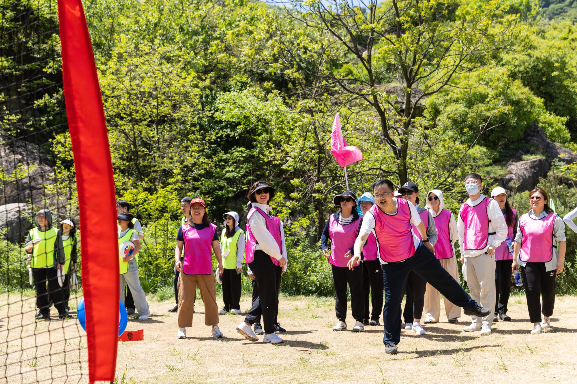 凝心聚力,共创佳绩。到达团建场地后,趣味十足的户外飞盘运动拉开了序幕。团建教练带领大家进行团队分组、赛前热身,并细心传授飞盘运动技巧。分组协作练习后,紧张激烈的飞盘保龄球、飞盘投篮、飞盘九宫格等比赛依次开战。一起奔跑,凌空跳跃,每一次抛盘和接盘,都在考验着队友之间的协作配合。大家在肆意奔跑中挥汗解压,在欢声笑语中享受着运动的快乐、合作的快乐。