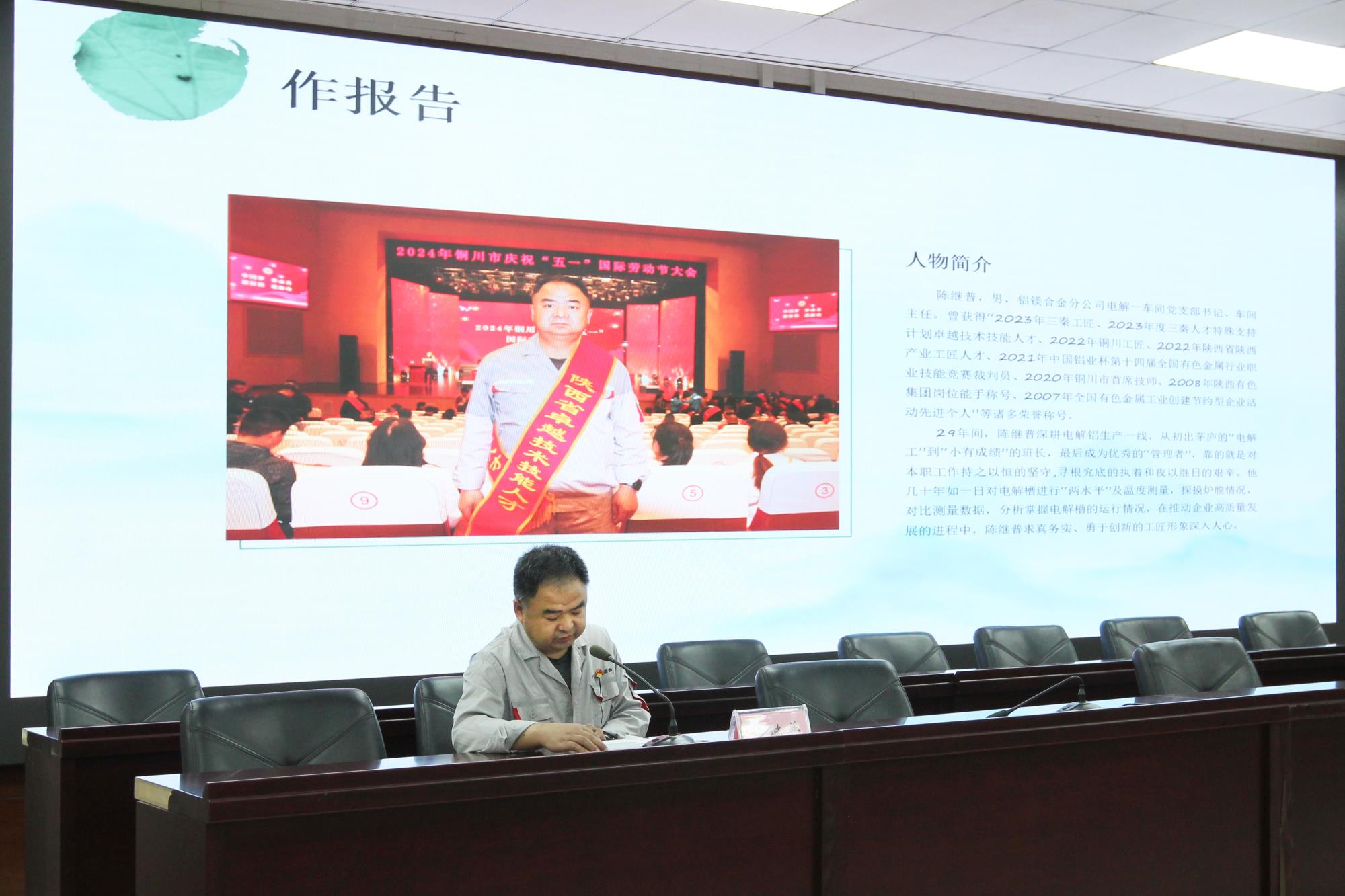 在作报告环节,陕西美鑫公司职工代表—“三秦工匠”陈继普为大家分享了他在工作中体会的感悟。1994年被招工到铜川铝厂,他一干就是三十年,从电解工到小组长、班长、工区长、车间主任,从派遣外出受所在单位表彰到进入铝镁合金分公司,从“2020年铜川市首席技师”到“2023年三秦工匠”,他一步一个脚印踏踏实实地努力,在平凡的岗位上默默耕耘。他勇于担当、敬业奉献的先进事迹也深深打动了在场的每一位职工,大家纷纷表示要以他们为榜样,不断提升自己的道德修养和工作能力,不懈耕耘、孜孜以求,创造无怨无悔人生。