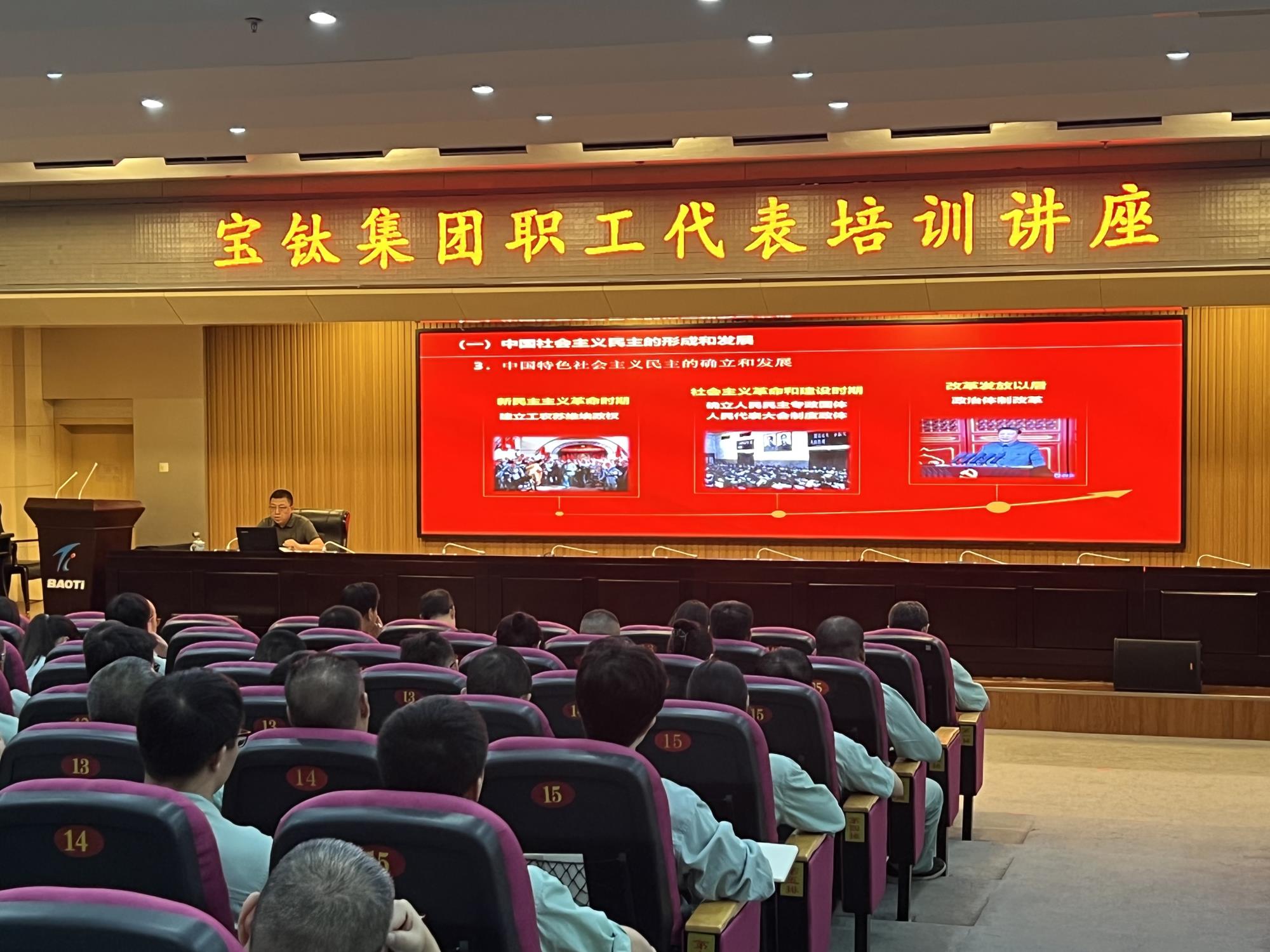 为提高职工代表工作水平,切实做好民主管理工作,6月3日,宝钛集团工会在宝钛宾馆 7 楼学术报告厅举办了职工代表培训讲座。宝钛集团194名职工代表聆听讲座。