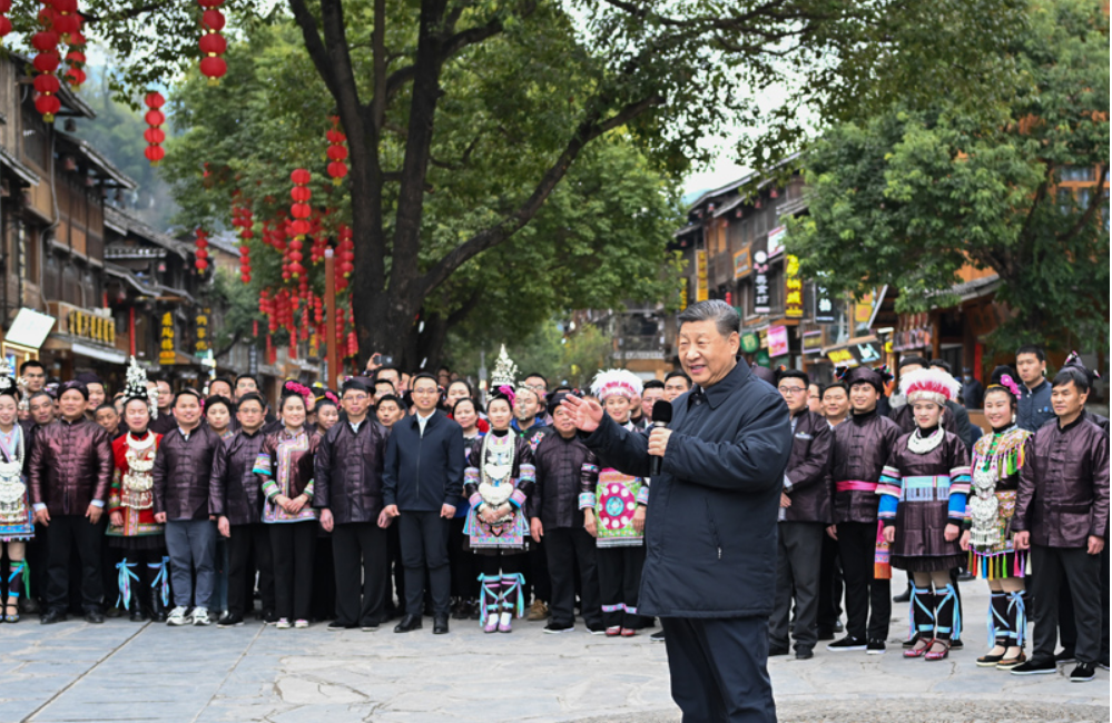 从鼓楼起身,村民们纷纷簇拥过来,热烈鼓掌,高声向总书记问好。习近平高兴地回应说,侗族人民朴实、勤劳、有文化、有智慧,希望大家在中国式现代化进程中把乡村振兴搞得更好,祝愿大家的日子越过越红火。离开侗寨时,侗族群众深情地唱起《侗歌声声唱给党》,表达对总书记的热爱和依依不舍。习近平频频挥手,同乡亲们道别。