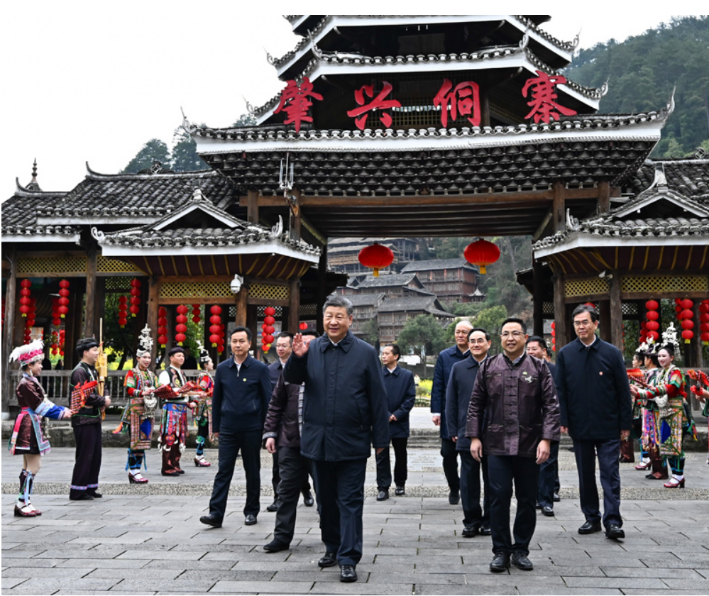 3月17日至18日,中共中央总书记、国家主席、中央军委主席习近平在贵州考察。这是17日下午,习近平在黔东南州黎平县肇兴侗寨考察时,在寨门口向身着民族盛装欢迎的村民挥手致意。