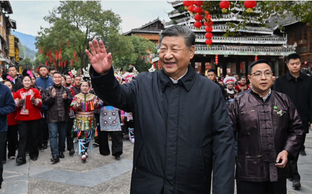 这是17日下午,习近平在黔东南州黎平县肇兴侗寨考察结束时,同乡亲们挥手道别。