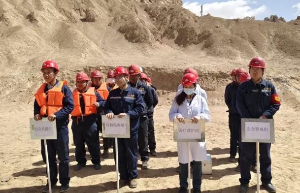 演练模拟因遭遇持续强降雨,山体滑坡堵塞尾矿库排洪系统,库内水位急剧上升,即将面临漫坝造成环境污染事件。演练开始后,格尔木银兴公司安委会立即启动应急预案,并及时向甲方相关部门报告险情,迅速成立现场应急救援指挥部,紧急调集抢险、医疗、警戒、后勤保障四支救援力量,快速赶赴事故现场开展救援。各应急救援小组严格依据应急预案和既定职责分工,各负其责,有条不紊地迅速展开疏散、警戒、应急物资及时到位,按预案处置措施现场施救,完成排洪系统的清理、坝顶加固,险情解除。