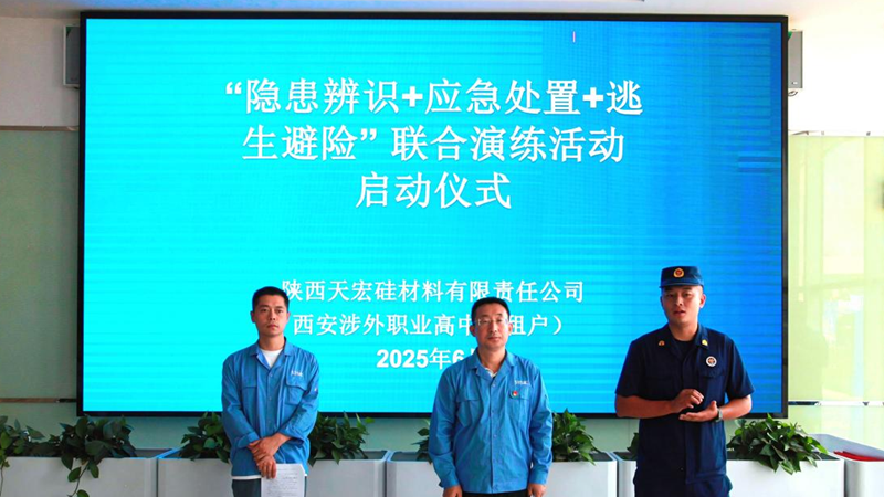 为深入学习贯彻习近平总书记关于安全生产的重要论述和重要指示批示精神,全面落实国务院、省安委办及集团公司 2025年“安全生产月”活动相关要求,持续提升全员消防安全意识和应急处置实战能力,6月26日上午,陕西天宏硅材料有限责任公司携手秦汉新城消防支队、西安涉外职业高中,于天宏硅业研发大厦成功举办了以“隐患辨识+应急处置+逃生避险”为主题的综合演练活动。公司党委书记、董事长刘建中全程指挥并作动员讲话。