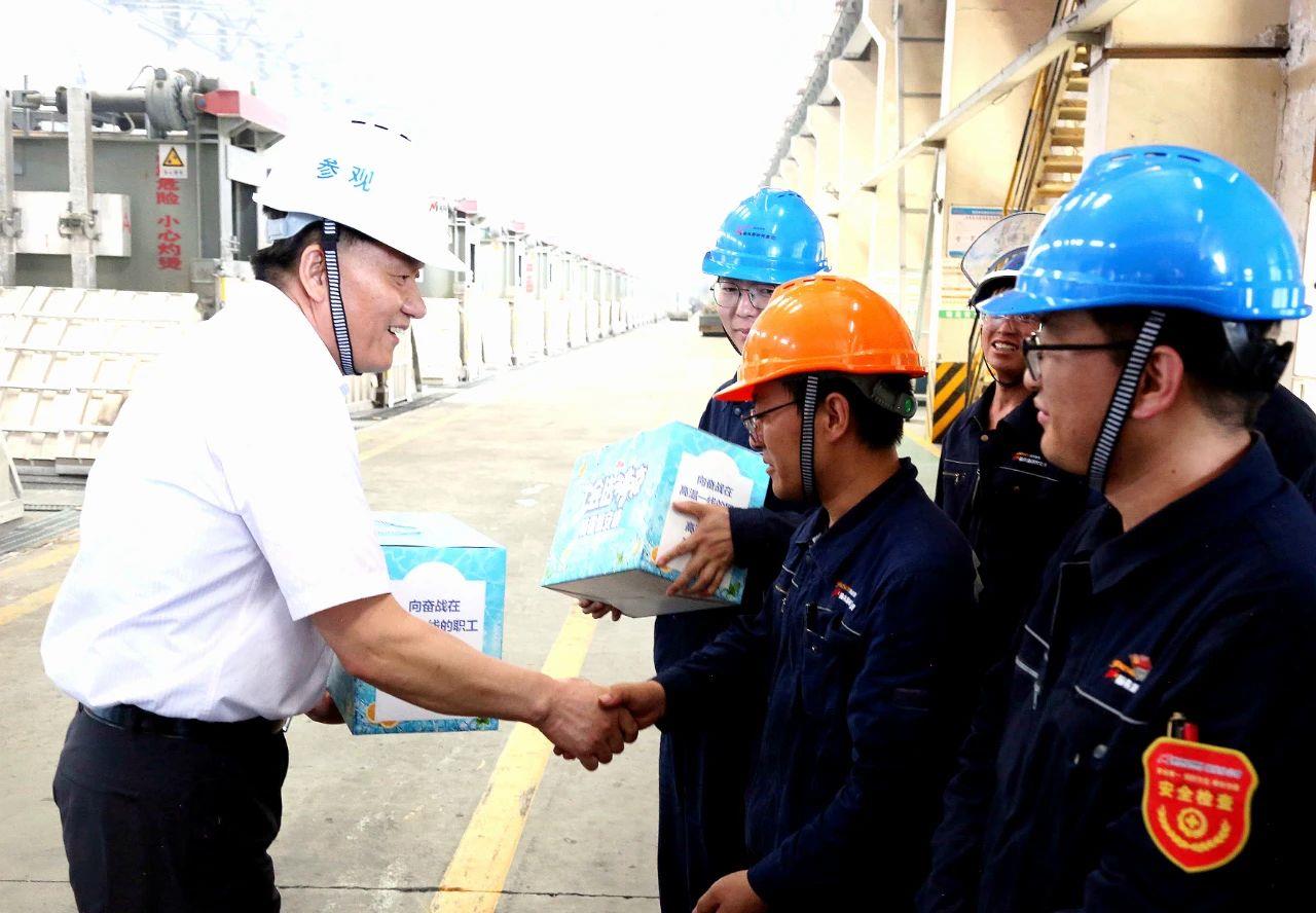 樊树森一行深入铝业分公司电解一车间,实地察看产业工人的工作环境,亲切慰问一线高温岗位上的职工,为他们送上防暑降温物品,叮嘱大家注意防暑降温,强化安全意识,确保安全生产。