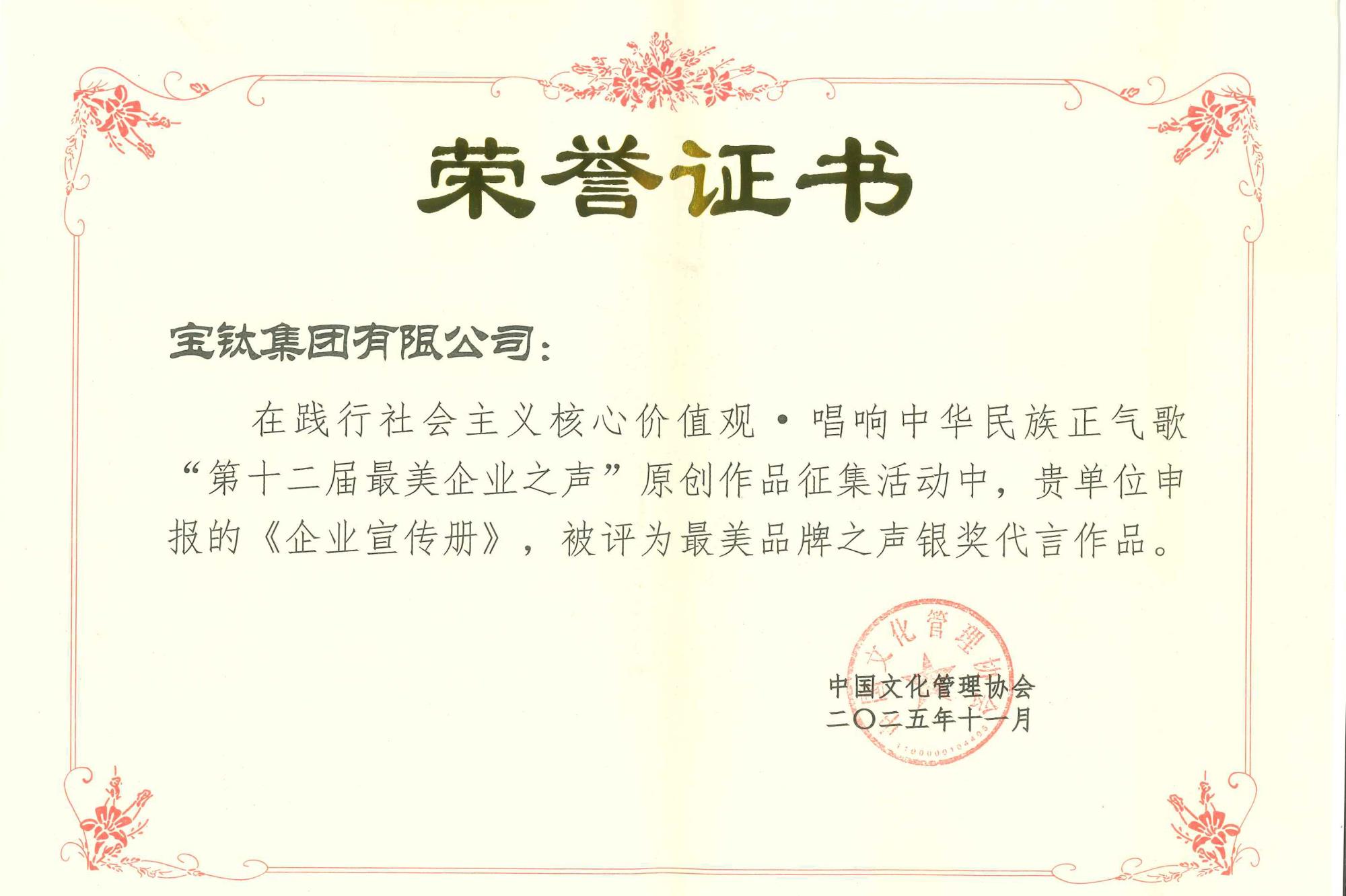 近日,2025中国文化管理协会企业党建与企业文化年会评选结果揭晓,宝钛集团凭借在企业文化建设与实践创新领域的突出成果,一举斩获多项重磅荣誉:作品《国之栋梁 兴钛强国》获评“最美先锋之声”金奖代言作品;企业宣传册荣获“最美品牌之声”银奖代言作品;案例《以文化之力赋能企业高质量发展》被评为文化强企优秀案例成果一等奖;宝钛集团党委书记、董事长王俭被授予“企业文化实践创新典范人物”荣誉称号等。