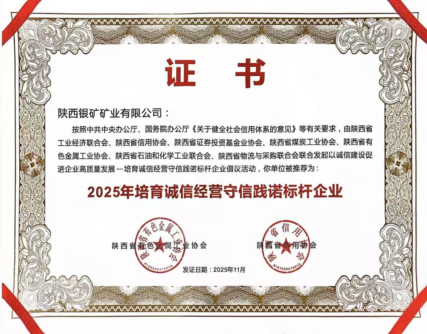 近日,陕西银矿矿业有限公司被陕西省有色金属工业协会与陕西省信用协会联合评为“2025年培育诚信经营守信践诺标杆企业”。这一荣誉标志着陕西银矿在诚信体系建设领域的成果获得行业与信用管理权威机构的双重认可。