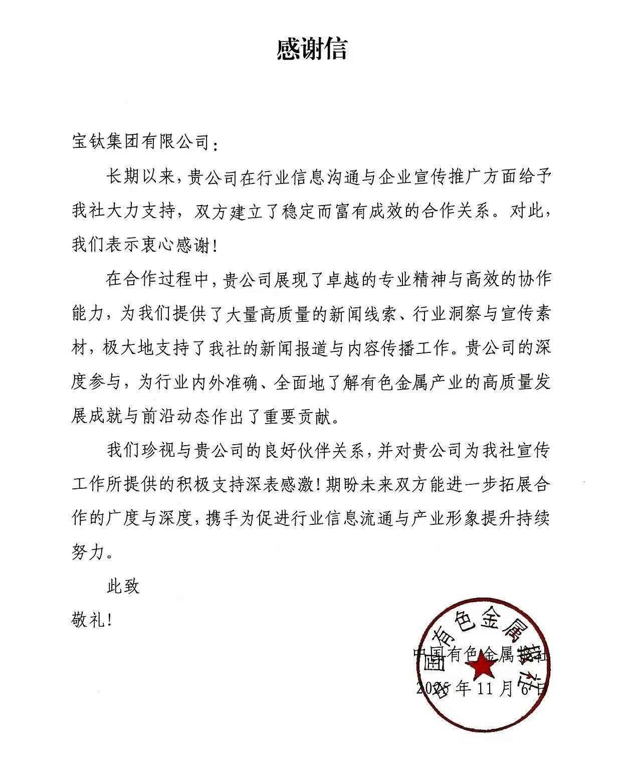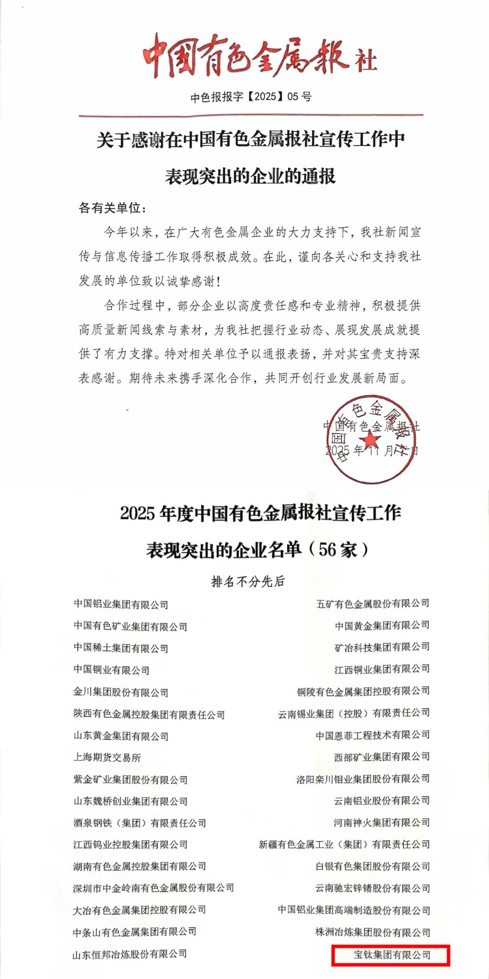 在近日召开的中国有色金属报社2025年宣传工作会议上,宝钛集团被评为宣传工作表现突出企业,宝钛集团文化新闻中心王丹被评为宣传工作表现突出个人,获得通报表扬。
