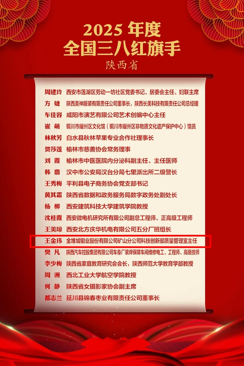3月2日,中华全国妇女联合会发布2025年度全国三八红旗手标兵、全国三八红旗手、全国三八红旗集体、全国巾帼文明岗名单,陕西省共有19名个人和12个集体获2025年度全国三八红旗手和全国三八红旗集体表彰。金钼集团科技创新人才一级专家、选矿正高级工程师王金玮被授予“全国三八红旗手”称号。