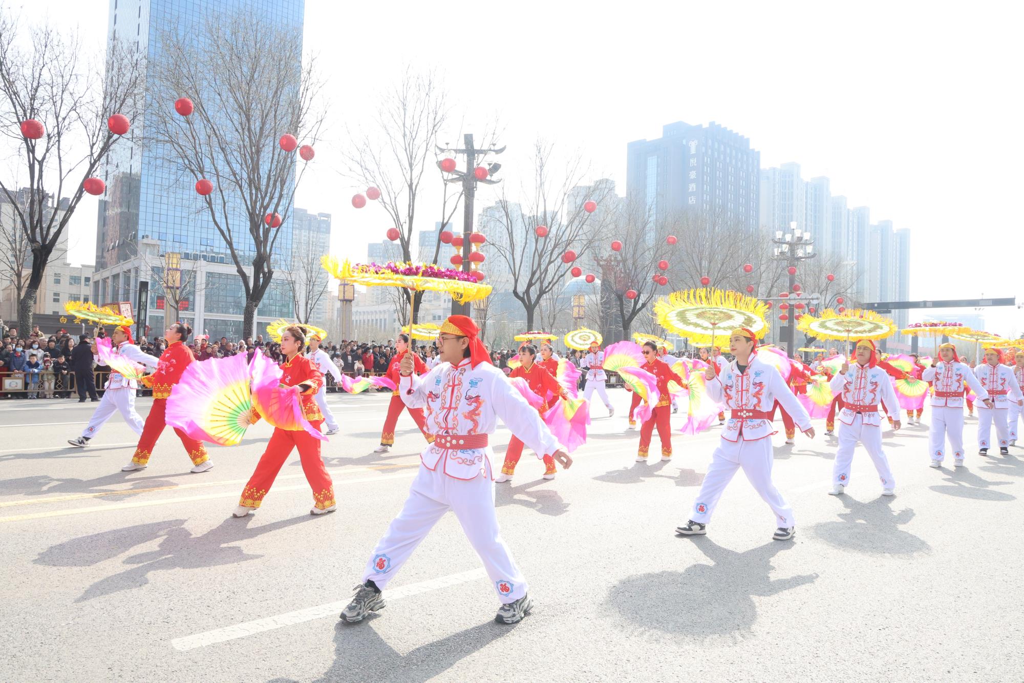 身着彩衣的秧歌队队员们手持彩扇、花伞,踏着欢快的鼓点,步伐轻盈而整齐。鲜艳的绸缎在空中划出优美的弧线,笑容在每一位队员的脸上绽放,充满感染力的动作引得路边观众纷纷举起手机记录。