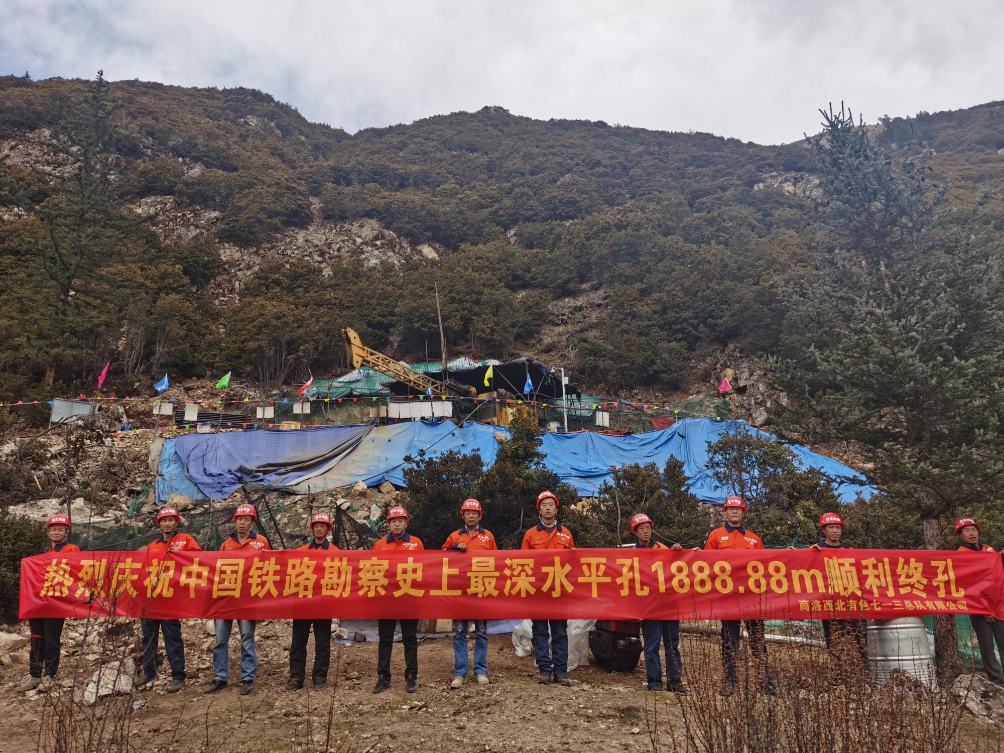 2019年至2020年,在被誉为“世纪工程”的川藏铁路勘察施工中,公司先后投入先进钻机22台套,调集骨干力量奔赴极端艰苦现场。项目共施工钻孔183个,累计完成钻探进尺43000余米,实现产值9000余万元。其中,两项小口径超深定向水平钻孔荣获地矿集团“2020年度重点项目创新发展奖”;高质量完成的1888.88米水平钻孔,一举创造国内铁路勘察史上小口径金刚石绳索取心水平孔最深施工纪录。