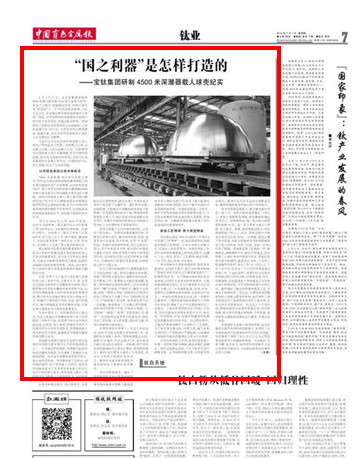 中国有色金属报:“国之利器”是怎样打造的——宝钛集团研制4500米深潜器载人球壳纪实