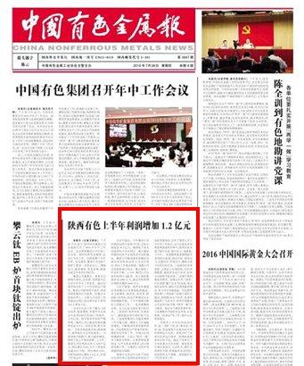 中国有色金属报:陕西有色上半年利润增加1.2亿元