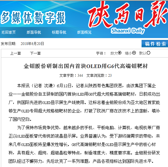 陕西日报:金钼股份研制出国内首块OLED用G6代高端钼靶材