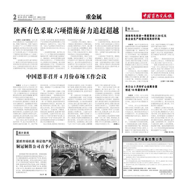 五是加快技术改造,推动企业转型升级。加快与美国REC公司的合作,推动企业国际化进程,提升国际影响力和竞争力。实施钼采选升级改造项目和钛及钛合金板材产业升级改造项目,全面提升有色金属采选加工能力及水平。
