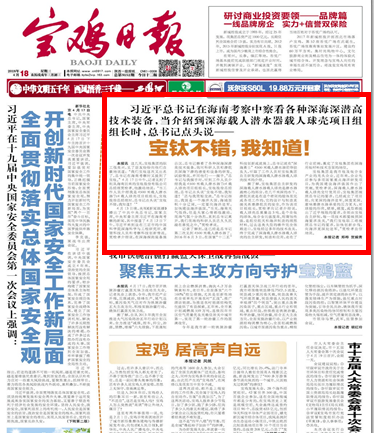 4月 13日晚,央视《新闻联播》播出了中共中央总书记、国家主席、中央军委主席习近平在海南考察的新闻,其中报道了 4月 12日下午,习近平来到设在三亚市的中国科学院深海科学与工程研究所,看望科技人员和考察科技创新情况。贾栓孝介绍说,在深海探测装备展示区,总书记察看了各种深海深潜高技术装备,询问科研人员和潜航员深海下潜的感受和设备的研发、试验情况,并同他们一一握手。“总书记与我握手时,听到工作人员介绍我是 4500米载人潜水器 Tc4载人球壳项目组组长、宝钛股份总经理,总书记点头说‘宝钛不错,我知道!’还与我简短交流。”总书记指出,我国是一个海洋大国,海域面积十分辽阔。一定要向海洋进军,加快建设海洋强国。“当天,海南天气很热,但是大家心情都很激动,现场气氛十分热烈,直到总书记离开,我们现场的科研人员还久久沉浸在喜悦之中。”贾栓孝说。