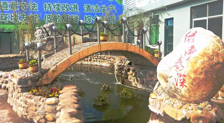 最吸引眼球的莫过于车间办公室前面的小花池了!形色各异的石头砌就的围堰独具特色,碧绿的池水上架着一座微型拱桥,废旧物料制作的银白色立柱、圆球形套环与黑褐色铁链组成的安全护栏,一下子把小桥装扮得韵味十足。两块形态独特的文化石屹立在池水中,一块写着“清风池”,另一块写着“绿净春深”;水面上的喷头如一朵小莲花正吐露着银色的水花;难得的暖阳洒向水面,红色、黄色、银白色的小金鱼闻声成群结队地向我们游来,不时激起一圈圈涟漪。“清风池”上微风徐来,“绿净春深”意境悠远,怎一个美字了得?不由得让人驻足观望,仿佛自己走进了闹市中公园一角。