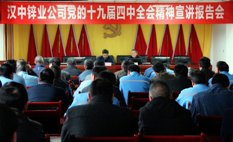 12月19日上午,集团党委宣讲团成员、煎茶岭镍业党委书记杨宏信到汉中锌业为广大党员干部宣讲党的十九届四中全会精神。宣讲报告会由汉中锌业公司党委书记、董事长何学斌主持。