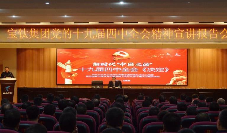 12月4日上午,集团党委宣讲团到宝钛集团宣讲党的十九届四中全会精神。集团党委宣讲团成员,宝钛集团党委副书记、工会主席王建超作宣讲报告。宝钛集团助理以上领导干部、各单位专兼职党务干事、千阳产业扶贫公司代表等200余人聆听报告。宝钛集团党委宣传部部长王建昌主持宣讲。