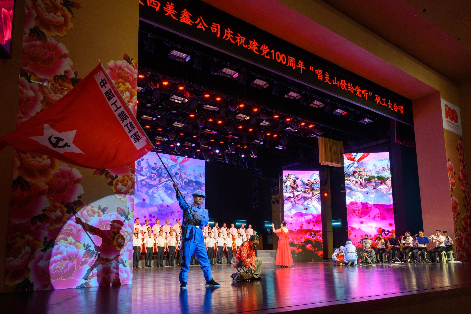 阳极分公司合唱表演《共筑中国梦》,唱出了全体美鑫人整装待发,携手并肩,同祖国同频共振,与中国梦合流并进的坚强意志。唱出了美鑫人对党的礼赞和对祖国的热爱之情,也让现场观众深受感染。