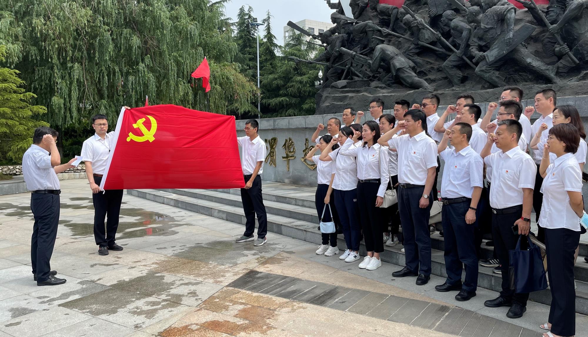 渭华起义纪念碑前,全体党员在党委书记葛琦的带领下,面对党旗,重温入党誓词,誓言铿锵有力,振奋人心。