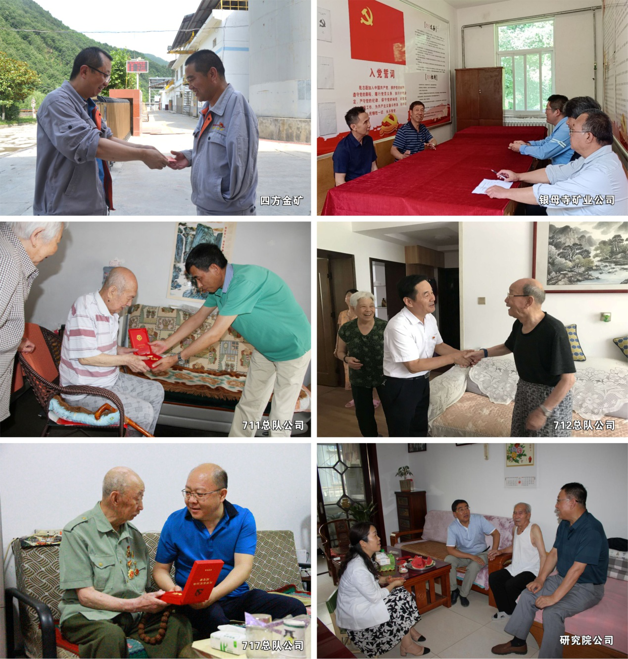 6月29日,两集团党委书记、董事长秦西社深入研究院公司,慰问了离退休党员李军,认真倾听老人所盼、所想、所需,感谢他为两集团地勘事业发展做出的贡献,并代表两集团党委为他颁发了“光荣在党50年”纪念章,送上了慰问金。连日来,711总队公司、712总队公司、713总队公司、717总队公司、地机院公司、工程公司、研究院公司、物化探公司、铅硐山(旺峪)矿业公司、银母寺矿业公司、四方金矿等单位积极响应两集团党委号召,陆续开展了走访慰问活动。每到一户,工作人员都详细询问老党员、困难党员的家庭情况和身体状况,细致了解生活中存在的困难,对他们为党的事业、为企业发展付出的艰辛努力表示衷心感谢,为他们送上慰问金,聆听他们的入党故事和奋斗经历,并为党龄达到50周年的老党员颁发了“光荣在党50年”纪念章。