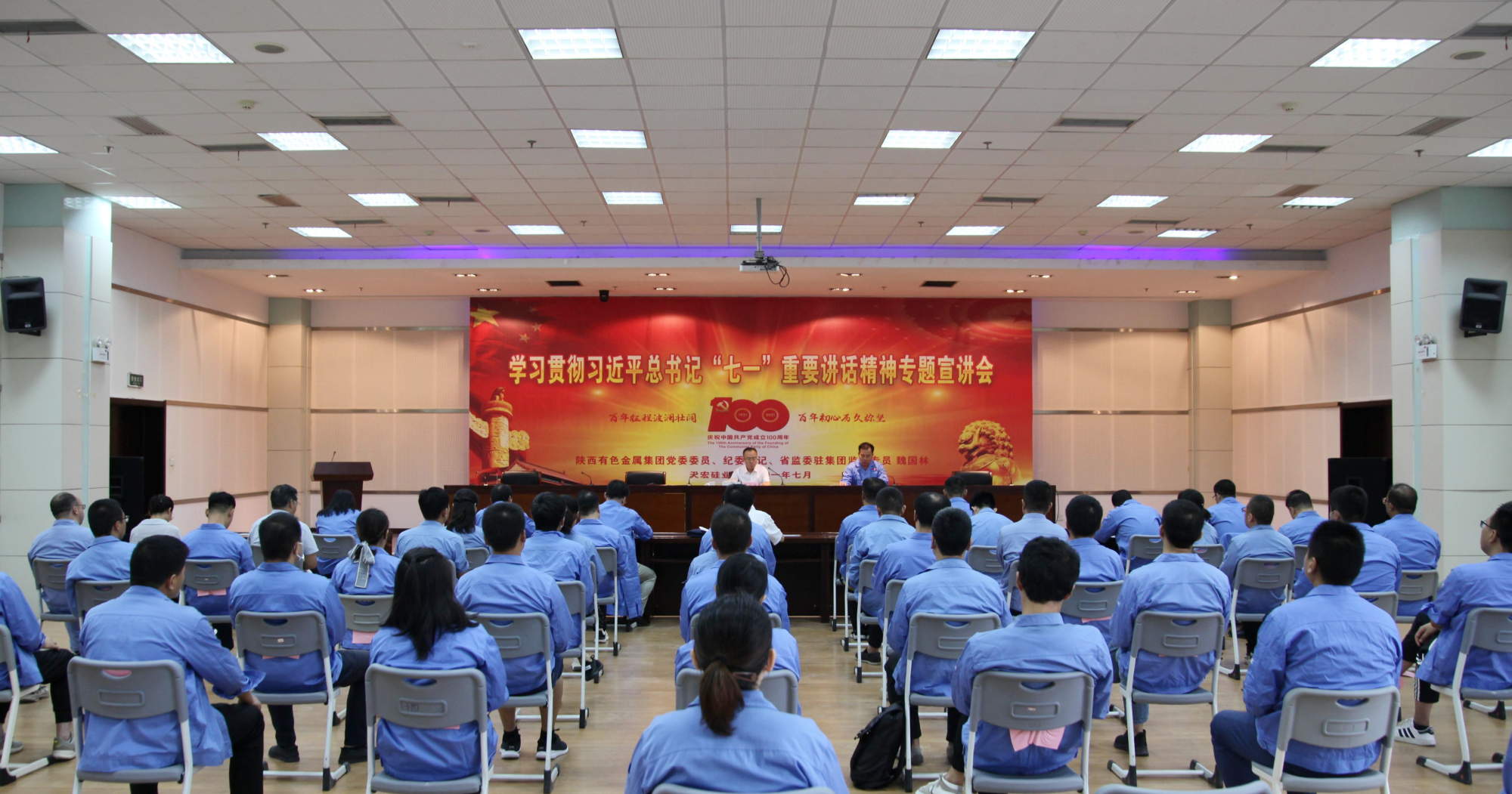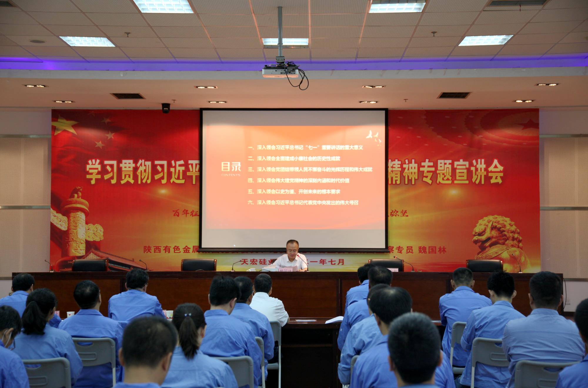 为深入学习贯彻习近平总书记在庆祝中国共产党成立100周年大会上的重要讲话精神,推动党史学习教育不断走向深入,7 月27日,威廉体育williamhill官网党委委员、纪委书记、省监委驻集团公司监察专员魏国林到天宏硅业宣讲习近平总书记“七一”重要讲话精神。集团公司纪委副书记苏怀岗参加。天宏硅业党委书记、董事长胡俊辉主持宣讲会。