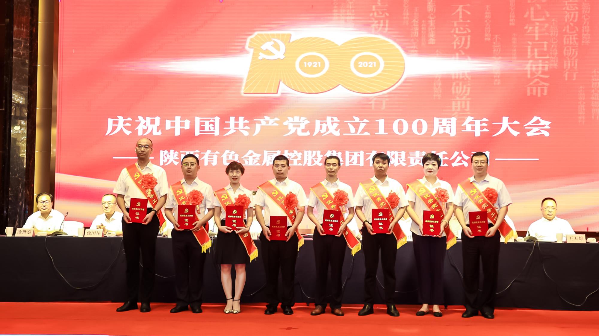 金钼集团金钼股份矿冶分公司三十亩地选矿厂王振山等50名优秀共产党员、宝钛集团锻造厂党总支书记宁伟军等20名优秀党务工作者、西安西北有色地质研究院党委等20个先进基层党组织受到集团公司党委表彰。集团公司领导向获得集团公司党委“两优一先”表彰的代表颁奖。荣获省委、省国资委党委表彰的优秀共产党员、优秀党务工作者、先进基层党组织负责人出席会议。