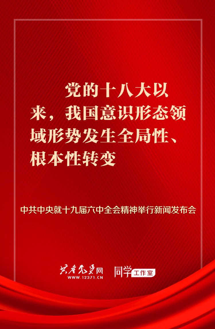 这次全会充分肯定了文化建设和意识形态工作取得的成绩,指出党的十八大以来,我国意识形态领域形势发生全局性、根本性转变,全党全国各族人民文化自信明显增强,全社会凝聚力和向心力极大提升,为新时代开创党和国家事业新局面提供了坚强思想保证和强大精神力量。