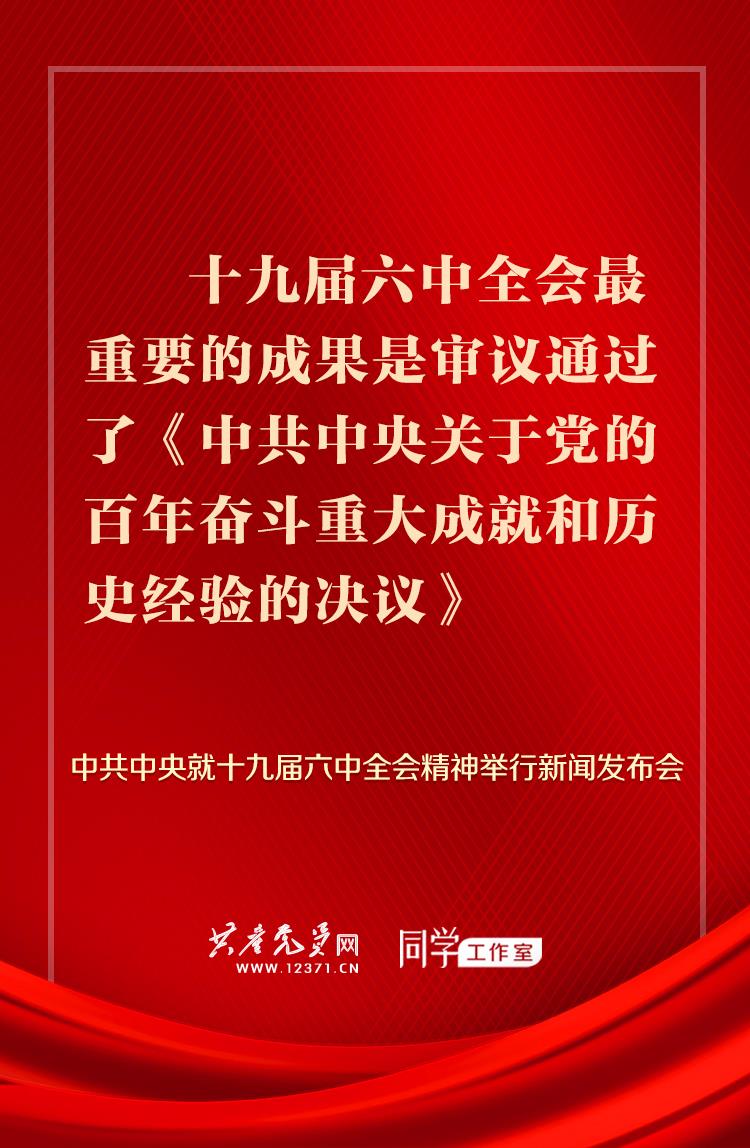 王晓晖:全会最重要的成果,是审议通过了《中共中央关于党的百年奋斗重大成就和历史经验的决议》。在建党百年之际,党中央召开六中全会,全面总结党的百年奋斗重大成就和历史经验,是郑重的历史性、战略性决策,体现了我们党重视和善于运用历史规律的高度政治自觉,体现了我们党牢记初心使命、继往开来的自信和担当。大家知道,在我们党的百年历程中,1945年党的六届七中全会制定了《关于若干历史问题的决议》,1981年党的十一届六中全会制定了《关于建国以来党的若干历史问题的决议》。两个历史决议产生的历史条件、时代背景、所要解决的问题有所不同,但都是在重大历史关头作出的,都对推动党和人民事业发展起到了重要作用。现在,距离第一个历史决议制定已经过去76年,距离第二个历史决议制定也过去了40年。40年来,党和国家事业大大向前发展了,党的理论和实践也大大向前发展了。站在新的历史起点上,回顾过去、展望未来,对党的百年奋斗历程特别是改革开放40多年的奋斗历程进行全面系统的总结,既有客观需要,也具备主观条件。