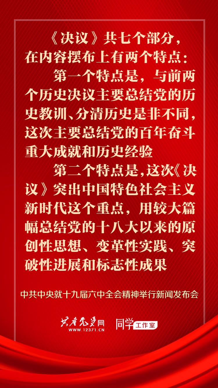 王晓晖:全会通过的《决议》共七个部分,在内容摆布上有两个特点:第一个特点是,与前两个历史决议主要总结党的历史教训、分清历史是非不同,这次主要总结党的百年奋斗重大成就和历史经验。从建党到改革开放之初,党的历史上的重大是非问题,前两个历史决议基本都解决了,其基本论述和结论至今仍然是适用的。改革开放以来,尽管党的工作中也出现过一些问题,但总体上党和国家事业发展是顺利的,前进方向是正确的,取得的成就是举世瞩目的。《决议》把着力点放在总结党的百年奋斗重大成就和历史经验上,符合实际,有利于推动全党增长智慧、增进团结、增加信心、增强斗志。二是重点总结新时代党和国家事业取得的历史性成就、发生的历史性变革和积累的新鲜经验。