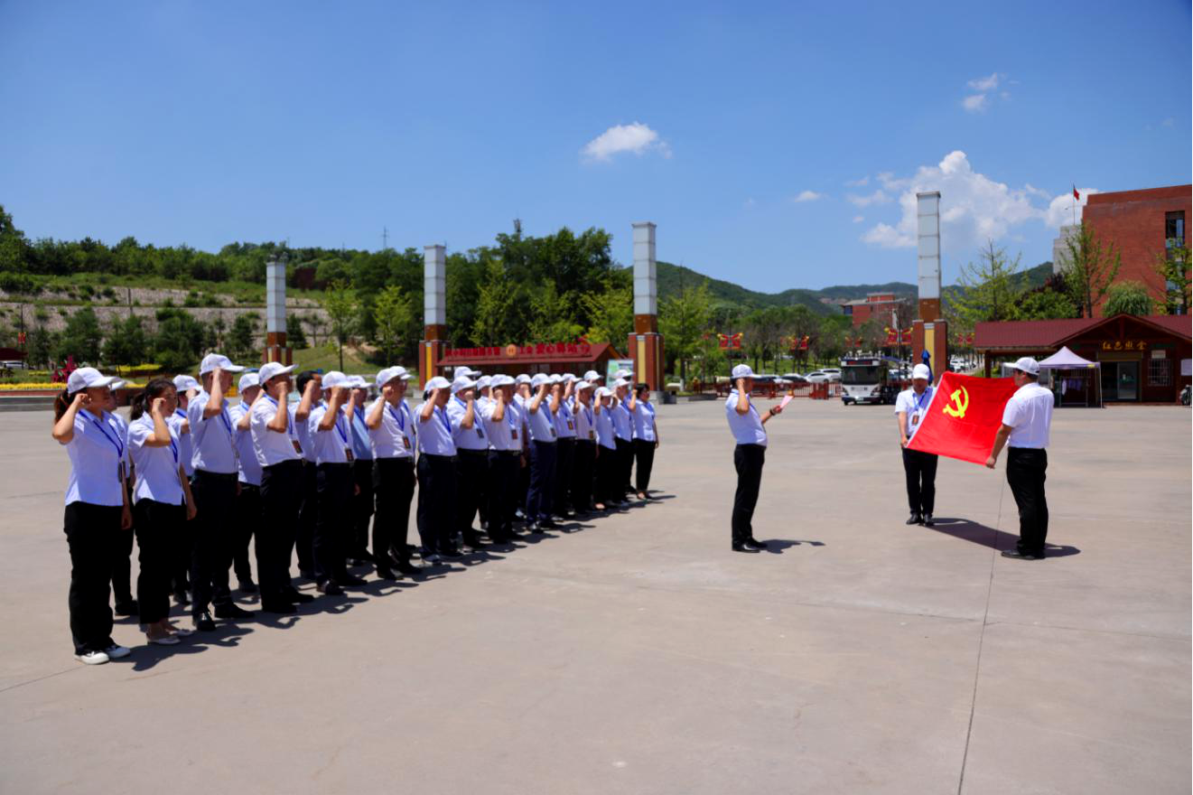 在陕甘边革命根据地照金纪念馆前,党员们面对党旗,重温入党誓词,以铿锵有力的宣誓表达不忘初心、牢记使命的坚定决心。